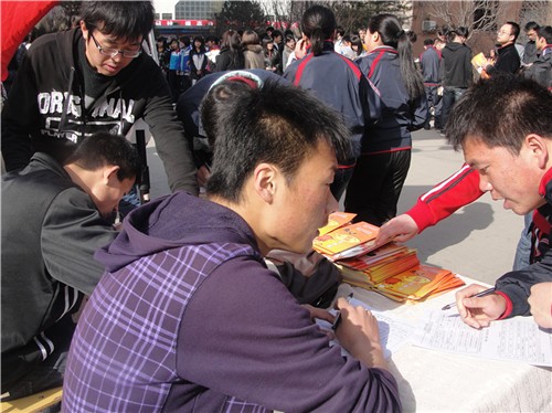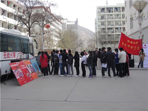 2011年3月12日上午9点,beat365中国官方网站团委联合延安市中心血站在我校图书馆前举行了大型学雷锋义务献血活动,早上的天气刮着风,有点冷,同学们依然早早的排队等候献血,我们为他们无私奉献的精神感动。学院党委副书记薛皓老师、辅导员封杰、杨亮、学生会干部和血站工作人员等400多人参加了组织、宣传义务献血活动,共散发义务献血宣传单800多份,有154名师生参加了献血,收集到31400毫升新鲜血液,一定程度上缓解了延安市用血紧张的局面。为了组织好本次活动,调动同学们的积极性,学院党委先后召开班主任会议、学生干部会议、班会进行义务献血宣传动员,宣传义务献血知识,宣讲义务献血的重要意义,并对部分同学做调查,减轻同学们对献血的陌生感和恐惧感。