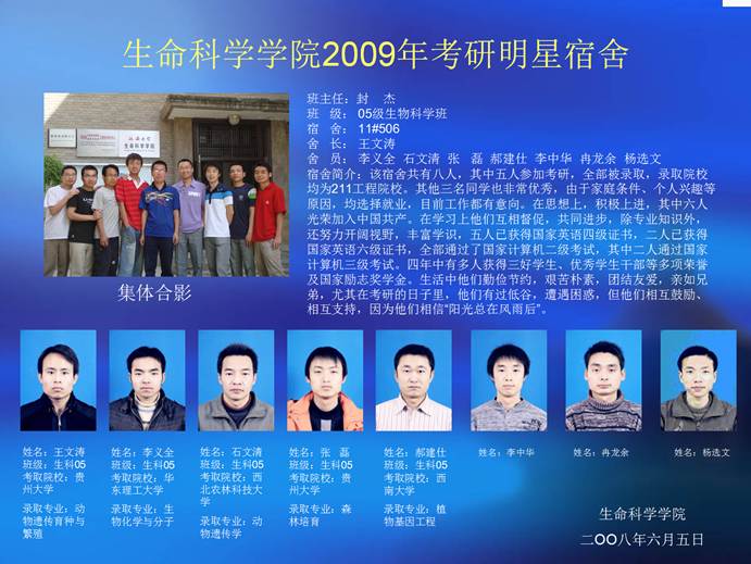 宿舍简介:该宿舍共有八人,其中五人参加考研,全部被录取,录取院校均为211工程院校。其他三名同学也非常优秀,由于家庭条件、个人兴趣等原因,均选择就业,目前工作都有意向。在思想上,积极上进,其中六人光荣加入中国共产党。在学习上他们互相督促,共同进步,除专业知识外,还努力开阔视野,丰富学识,五人已获得国家英语四级证书,二人已获得国家英语六级证书,全部通过了国家计算机二级考试,其中二人通过国家计算机三级考试。四年中有多人获得三好学生、优秀学生干部等多项荣誉及国家励志奖学金。生活中他们勤俭节约,艰苦朴素,团结友爱,亲如兄弟,尤其在考研的日子里,他们有过低谷,遭遇困惑,但他们相互鼓励、相互支持,因为他们相信“阳光总在风雨后”。