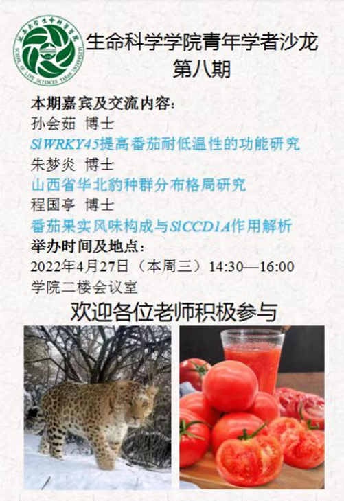 会上,孙会茹博士、朱梦炎博士和程国亭博士先后以“SlWRKY45在番茄低温应答中的功能研究”、“山西省华北豹种群分布格局及其廊道研究”和“番茄果实风味构成与SlCCD1A基因作用解析”的专题报告。孙会茹博士就在番茄低温应答中功能分析和调控番茄低温应答的分子网络3个方面进行了系统阐述,揭示了SlWRKY45转录因子通过清除活性氧提高番茄对低温胁迫的耐受性。朱梦炎博士对山西省华北豹种群分布特征、影响种群分布因素和华北豹核心保护区建设不足之处等方面进行了系统分析,并提出了建设性建议。程国亭博士着重阐述了糖、酸和挥发物对番茄风味的贡献,强调类胡萝卜素衍生挥发物对番茄风味贡献最大,通过提高SlCCD1A基因表达量可提升番茄风味品质。