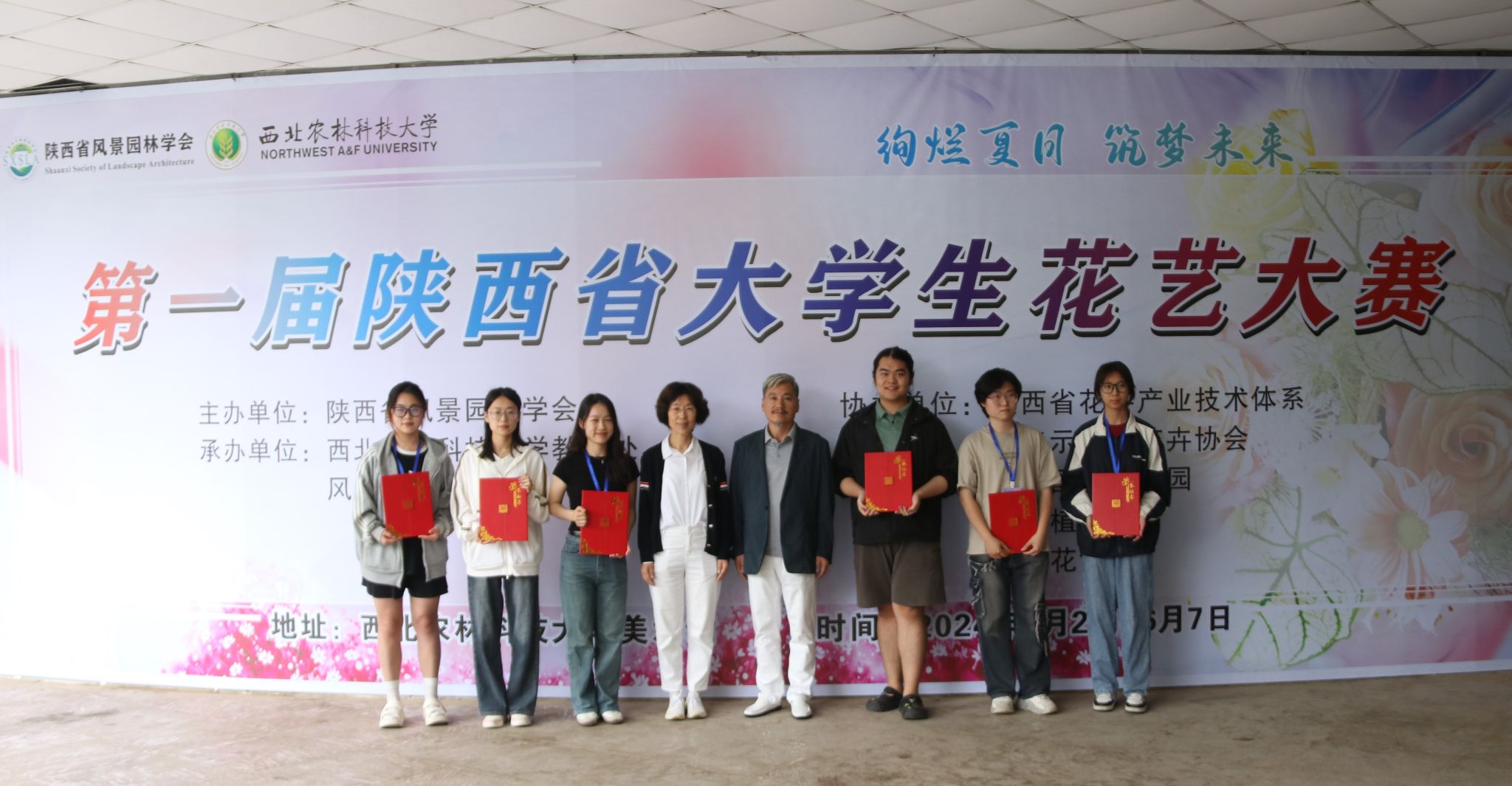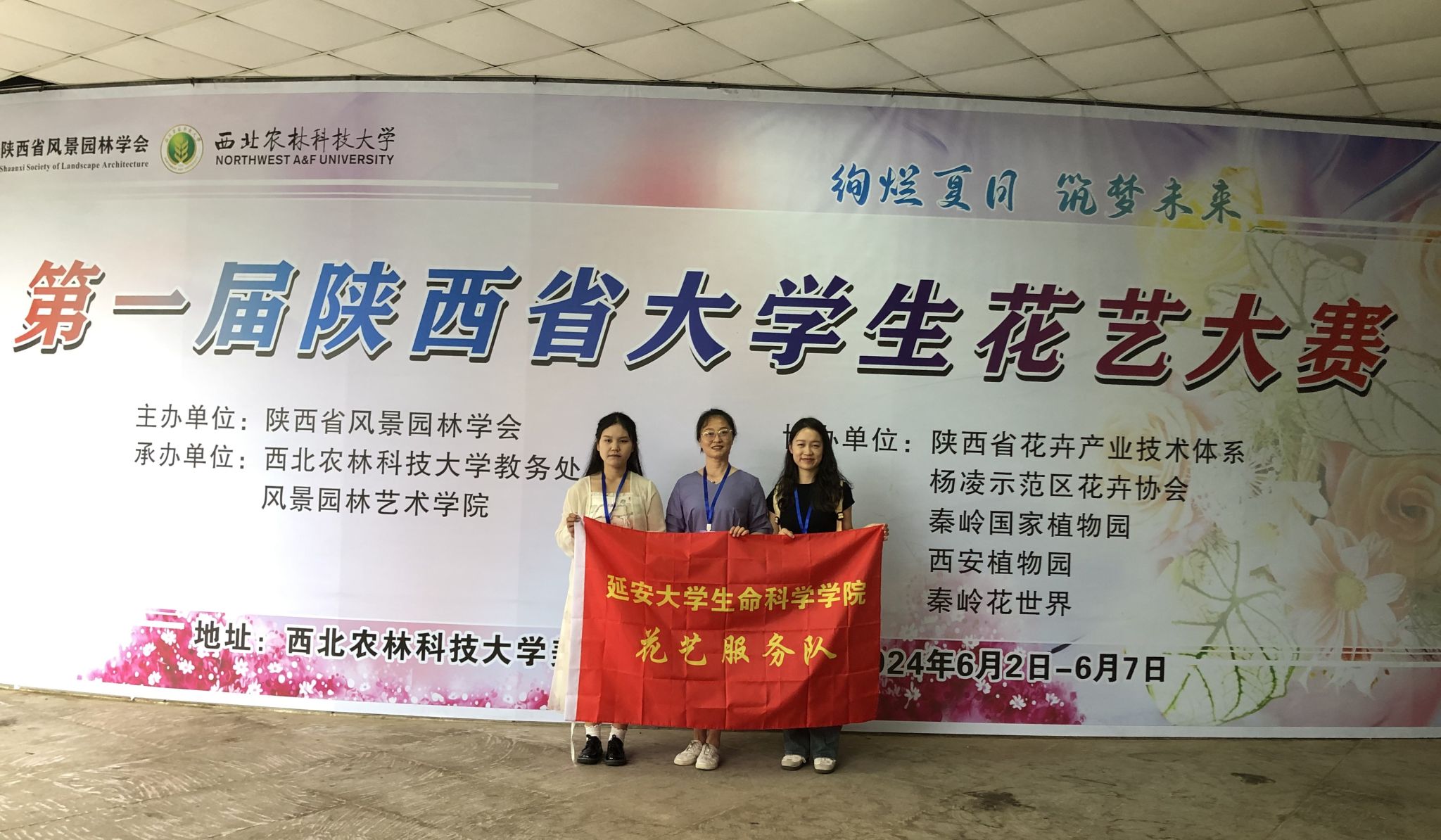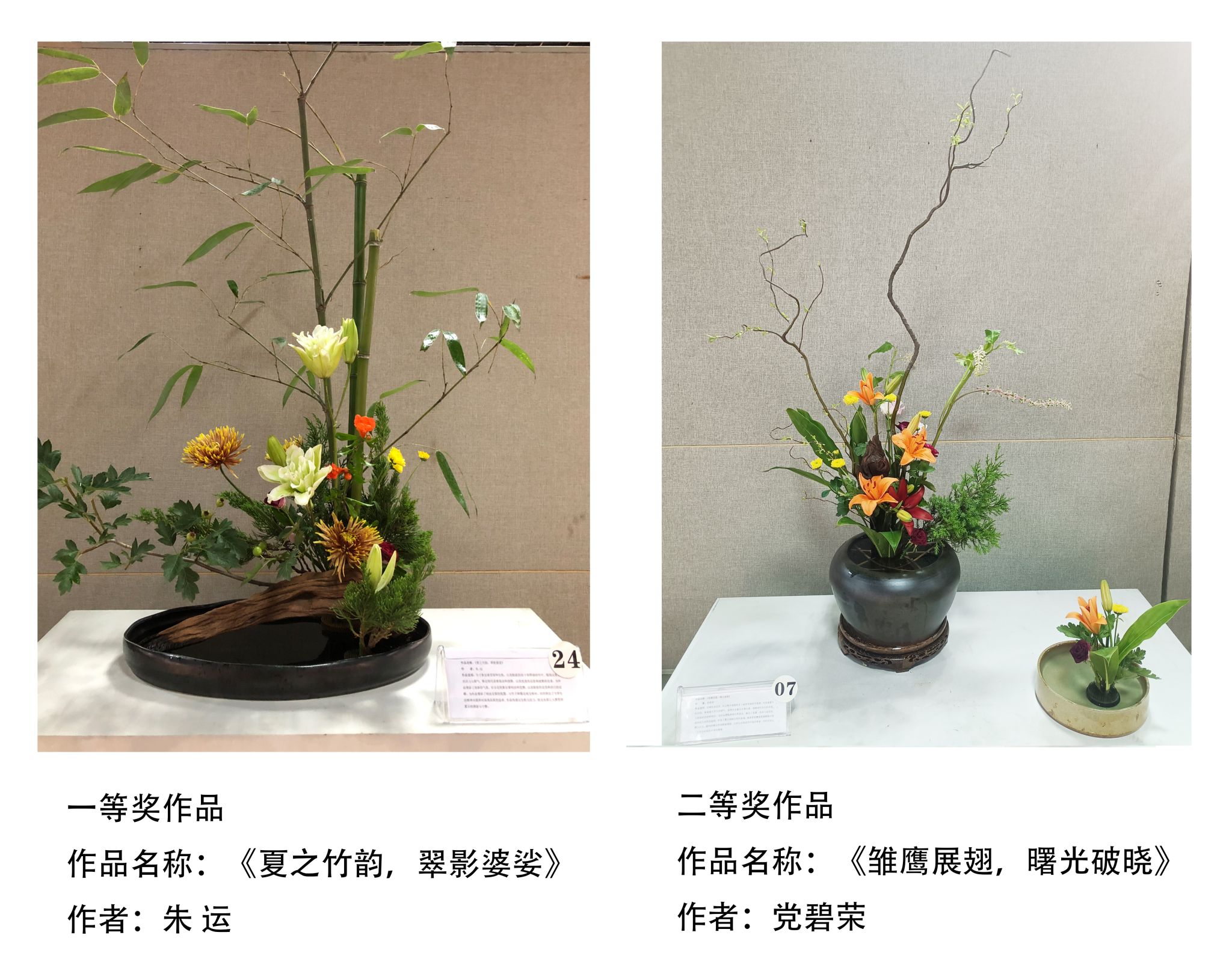 2024年6月1日—2日,由陕西省风景园林学会主办,西北农林科技大学承办的第一届陕西省大学生花艺大赛在西北农林科技大学美术馆举办。大赛项目分为插花艺术、盆景艺术、压花画类、立体干花类、花卉组合盆栽等5个模块。beat365中国官方网站园林系教师屈亚潭指导、园林专业朱运同学创作的作品《夏之竹韵,翠影婆娑》和党碧荣同学创作的作品《雏鹰展翅,曙光破晓》从插花艺术类决赛的24项作品中脱颖而出,分别获得一等奖和二等奖的好成绩。
