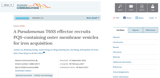 论文以“A Pseudomonas T6SS effector recruits PQS-containing outer membrane vesicles for iron acquisition”为题,揭示铜绿假单胞菌利用VI型分泌系统效应蛋白招募包含群体感应信号分子PQS (Pseudomonas quinolone signal)的外膜囊泡参与PQS-Fe3+摄取的分子机制。这一发现为铜绿假单胞菌VI型分泌系统、群体感应系统及铁摄取系统等研究领域带来了重大的突破,对预防和治疗由铜绿假单胞菌引起的感染具有重要指导意义。论文审稿人认为该研究是铜绿假单胞菌铁摄取领域里程碑式的研究(The manuscript reads very well and the data are extremely interesting. I read it with great interest and I think that it will be a milestone in the field of iron uptake by P. aeruginosa.)。