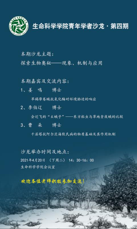 2021年4月20日,以“探索生命奥秘——现象、机制与应用”为主题的第四期青年学者沙龙活动在学院会议室顺利举行。本次活动前期筹备工作及现场主持由张晓曦副教授和南国卫博士执行,学院青年博士、教师等近30人参加了研讨活动。