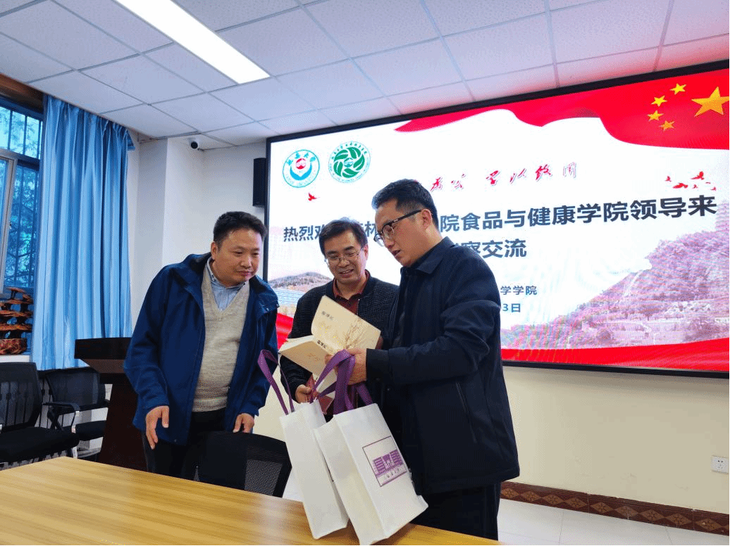 张向前院长首先对何志贵院长一行的到来表示欢迎,并向何院长赠送纪念书籍。随后,张院长介绍了延安大学的基本情况,介绍了生科院的发展历程与现状,从本科教学、研究生培养、人才队伍建设等多个方面做了介绍。何志贵对于张院长的介绍表示感谢,并简要介绍了食品与健康学院本科生培养、教学资源、教学评估以及社会服务方面的基本情况。